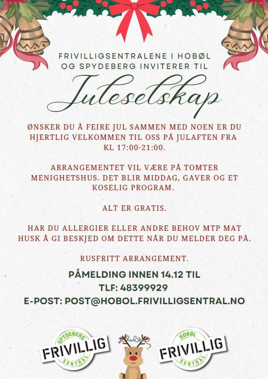Spydeberg og Hobøl Frivilligsentral inviterer til Juleselskap. Skal du tilbringe julaften alene, er du hjertelig velkommen til å feire kvelden med oss. Vi kan love god mat, hyggelig stemning og masse gode samtaler rundt bordet. I år samles vi på Tomter Menighetshus.Aldersgruppe: For alle